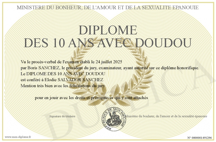 Envoyez par email votre DIPLOME DES 10 ANS AVEC DOUDOU personalisé