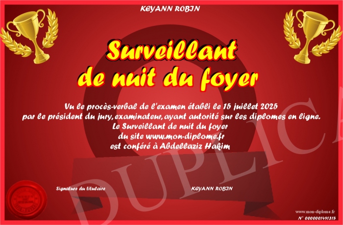 Envoyez par email votre Surveillant de nuit du foyer personalisé
