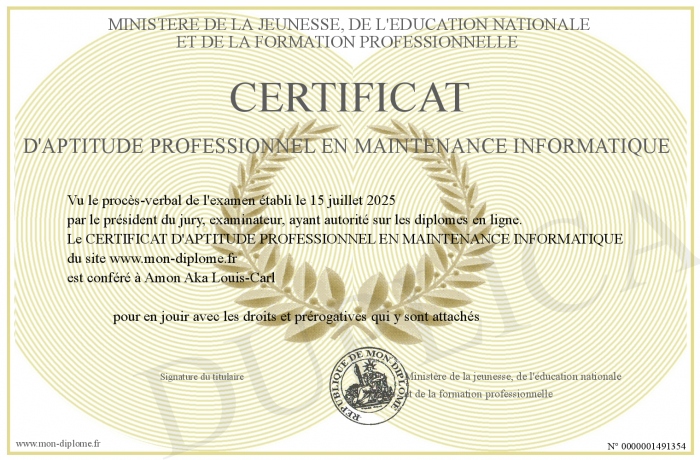 Envoyez par email votre CERTIFICAT D'APTITUDE PROFESSIONNEL EN MAINTENANCE INFORMATIQUE personalisé