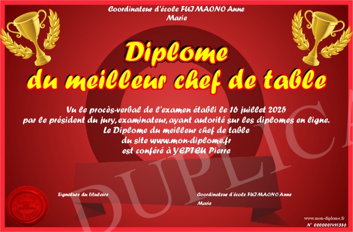 Envoyez par email votre Diplôme du meilleur chef de table personalisé