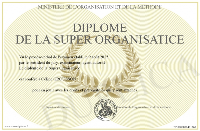Envoyez par email votre Diplôme de la Super Organisatice personalisé