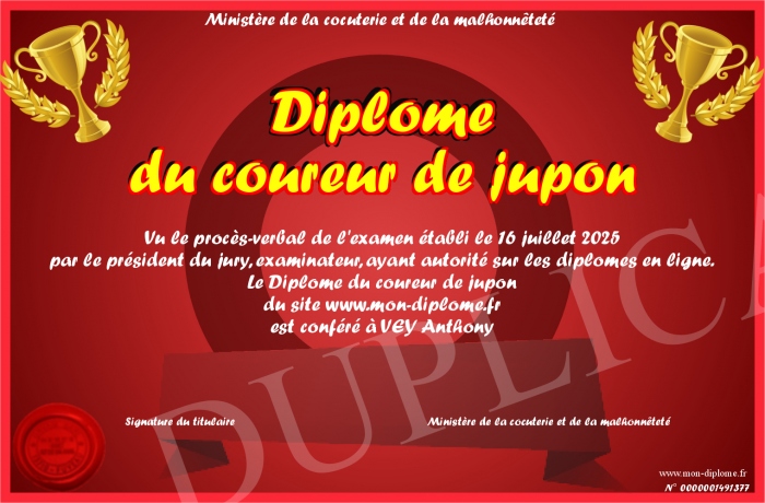 Envoyez par email votre Diplôme du coureur de jupon personalisé