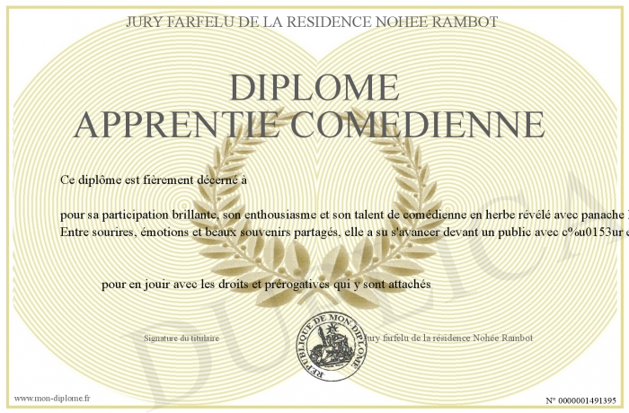 Envoyez par email votre Diplôme Apprentie Comédienne personalisé