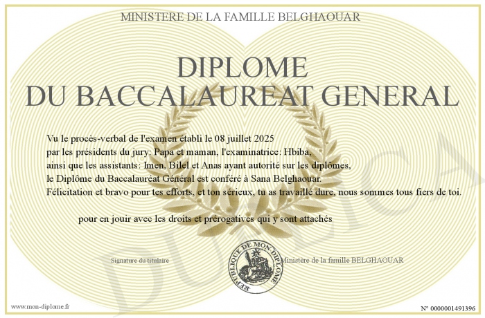 Envoyez par email votre Diplôme du baccalauréat général personalisé