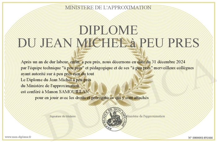 Envoyez par email votre Diplôme du Jean Michel à peu près personalisé