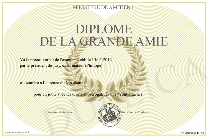 Envoyez par email votre Diplôme de la Grande Amie personalisé