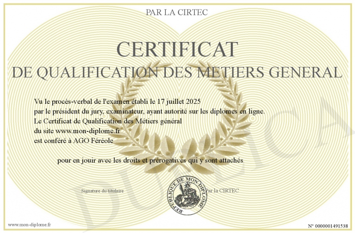 Envoyez par email votre Certificat de Qualification des Métiers général personalisé
