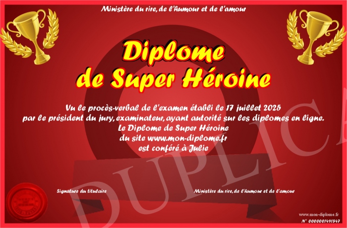 Envoyez par email votre Diplôme de Super Héroine personalisé