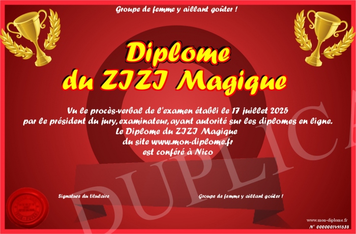 Envoyez par email votre Diplôme du ZIZI Magique personalisé