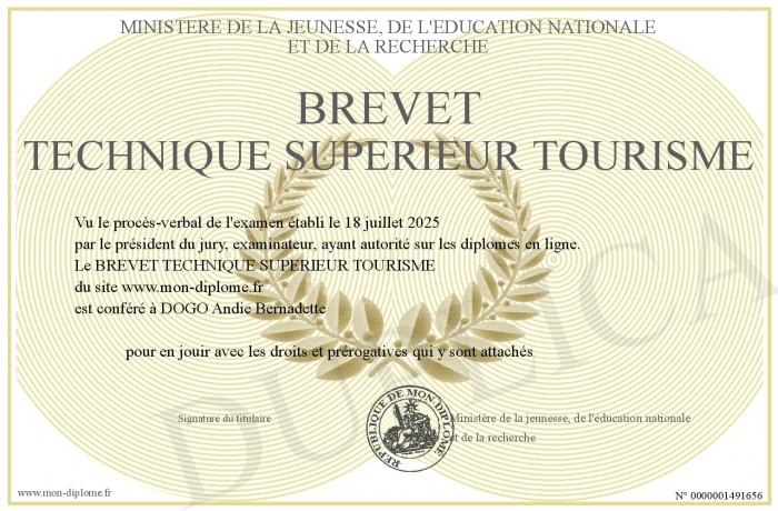 Envoyez par email votre BREVET TECHNIQUE SUPERIEUR TOURISME personalisé