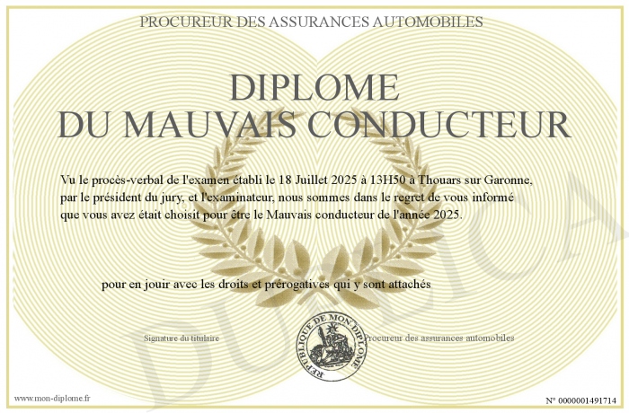 Envoyez par email votre Diplôme du mauvais conducteur personalisé