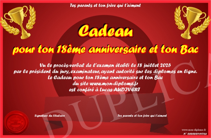 Envoyez par email votre Cadeau pour ton 18ème anniversaire et ton Bac personalisé