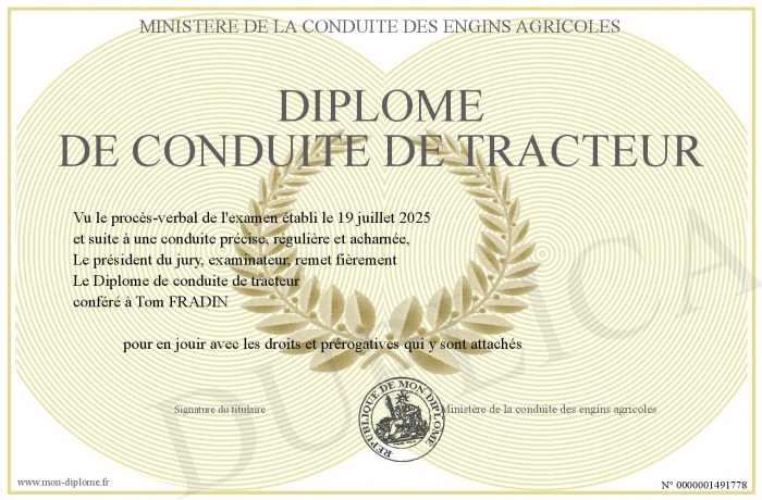 Envoyez par email votre Diplôme de conduite de tracteur personalisé
