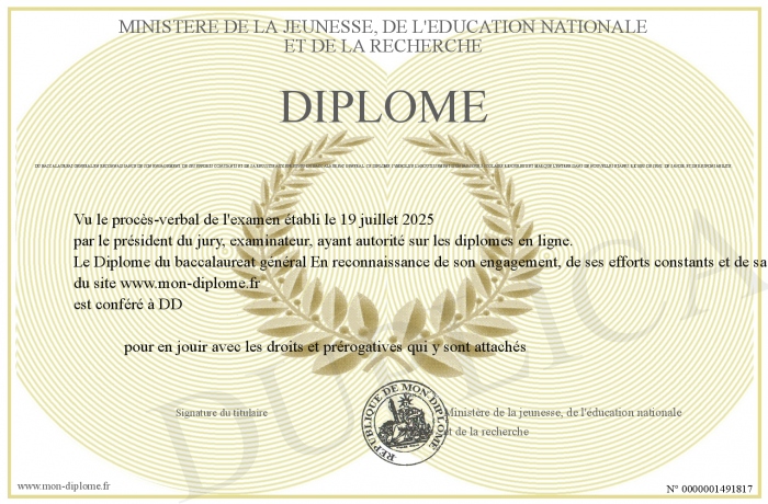 Envoyez par email votre Diplôme du baccalaureat général En reconnaissance de son engagement, de ses efforts constants et de sa réussite aux épreuves du Baccalauréat général. Ce diplôme symbolise l'aboutissement d'un parcours scolaire rigoureux et marque l'entrée dans de nouvelles étapes, riches de sens, de savoir et de responsabilité. personalisé