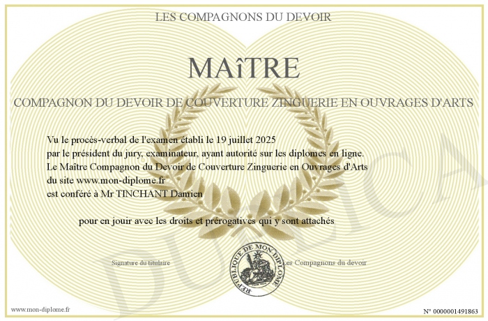 Envoyez par email votre Maître Compagnon du Devoir de Couverture Zinguerie en Ouvrages d'Arts personalisé