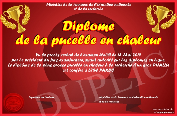 Envoyez par email votre Diplôme de la pucelle en chaleur personalisé