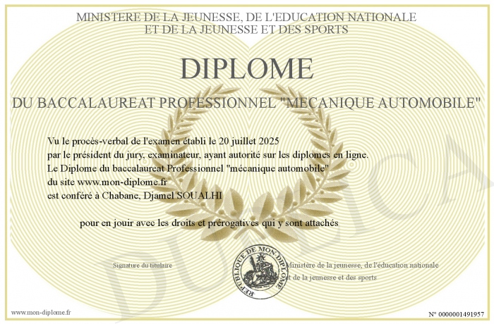 Envoyez par email votre Diplôme du baccalaureat Professionnel -mécanique automobile- personalisé