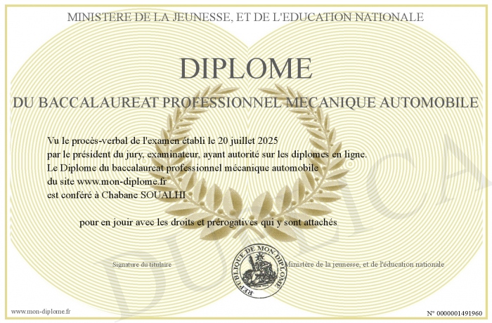 Envoyez par email votre Diplôme du baccalaureat professionnel mécanique automobile personalisé