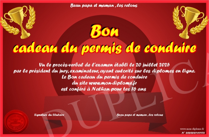 Envoyez par email votre Bon cadeau du permis de conduire personalisé