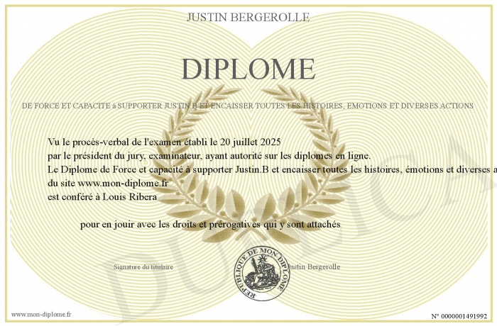 Envoyez par email votre Diplôme de Force et capacité à supporter Justin.B et encaisser toutes les histoires, émotions et diverses actions personalisé