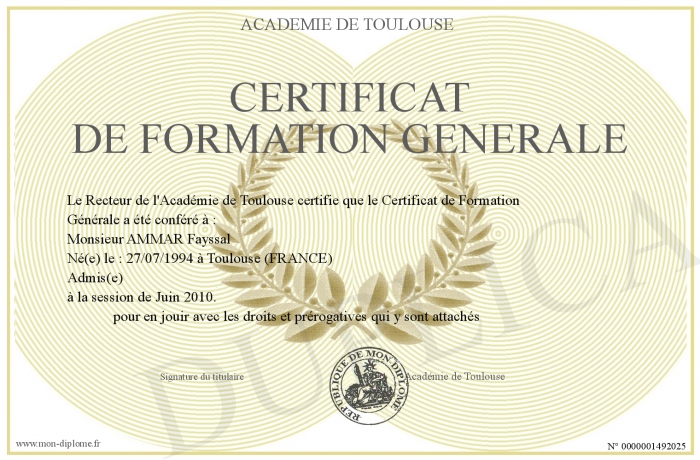 Envoyez par email votre Certificat de Formation Générale personalisé