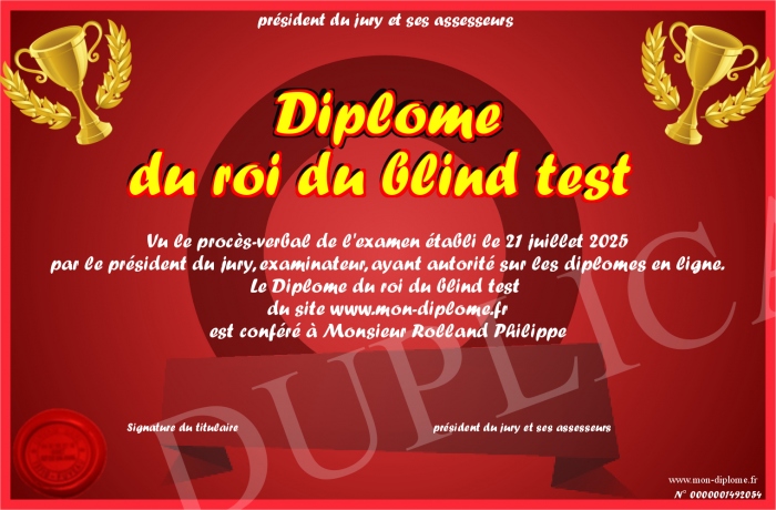 Envoyez par email votre Diplôme du roi du blind test personalisé