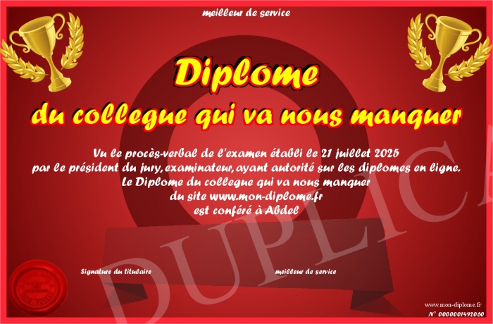 Envoyez par email votre Diplôme du collegue qui va nous manquer personalisé