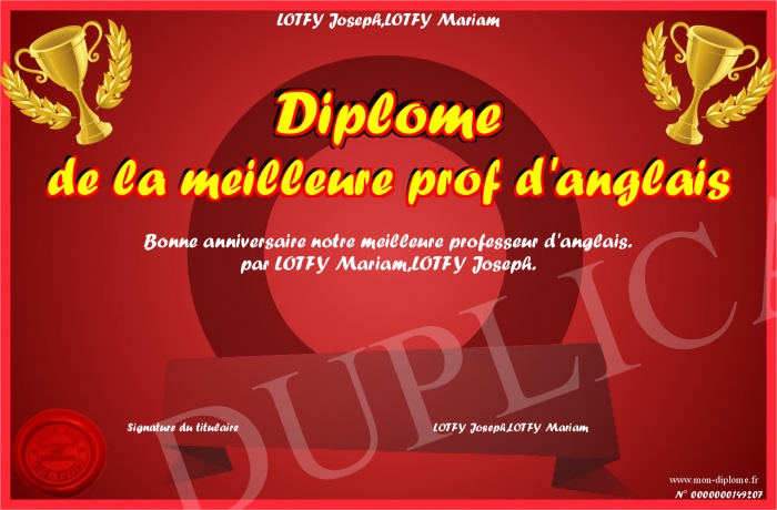 Envoyez par email votre Diplome de la meilleure prof d'anglais personalisé