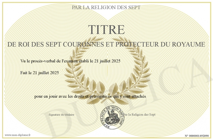 Envoyez par email votre Titre de Roi des Sept Couronnes et Protecteur du Royaume personalisé