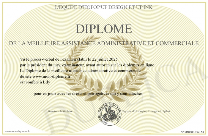 Envoyez par email votre Diplôme de la meilleure assistance administrative et commerciale personalisé