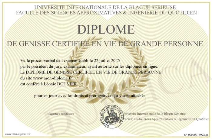 Envoyez par email votre DIPLOME DE GENISSE CERTIFIEE EN VIE DE GRANDE PERSONNE personalisé