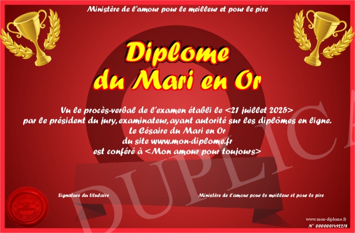 Envoyez par email votre Diplôme du Mari en Or personalisé