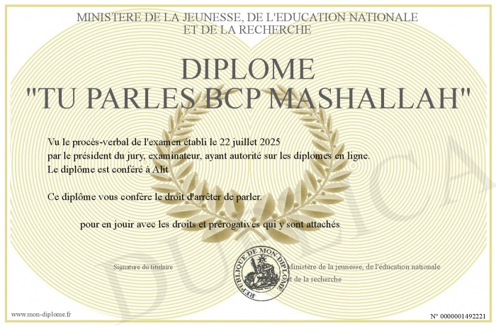 Envoyez par email votre Diplôme -tu parles bcp MashAllah- personalisé