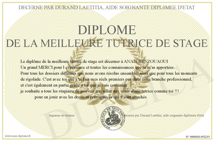 envoyé par le décerné par Durand Laetitia, aide soignante diplômée d'état !