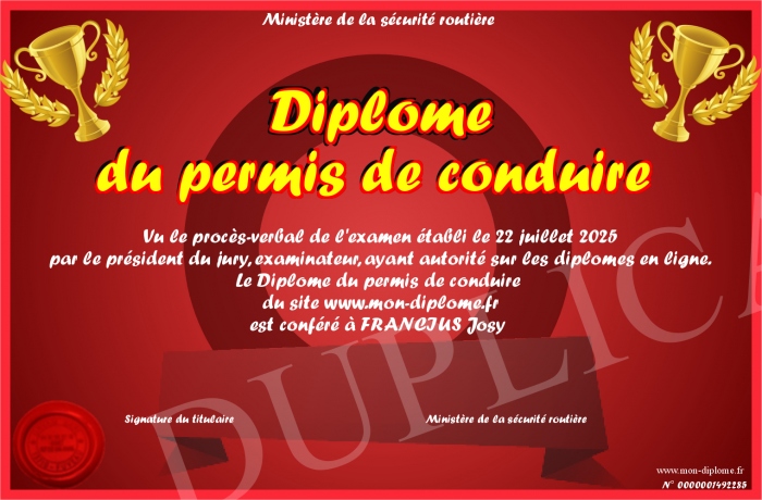 Envoyez par email votre Diplôme du permis de conduire personalisé