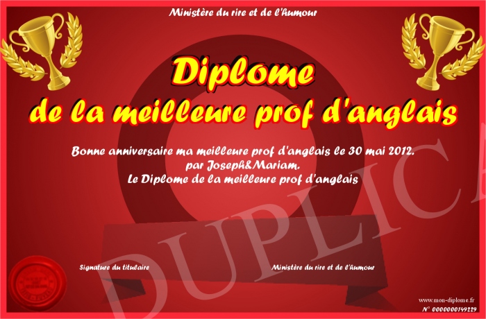Envoyez par email votre Diplome de la meilleure prof d'anglais personalisé
