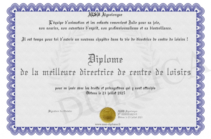 Envoyez par email votre Diplôme de la meilleure directrice de centre de loisirs personalisé