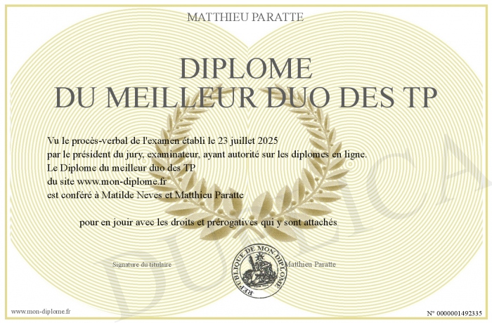 Envoyez par email votre Diplôme du meilleur duo des TP personalisé