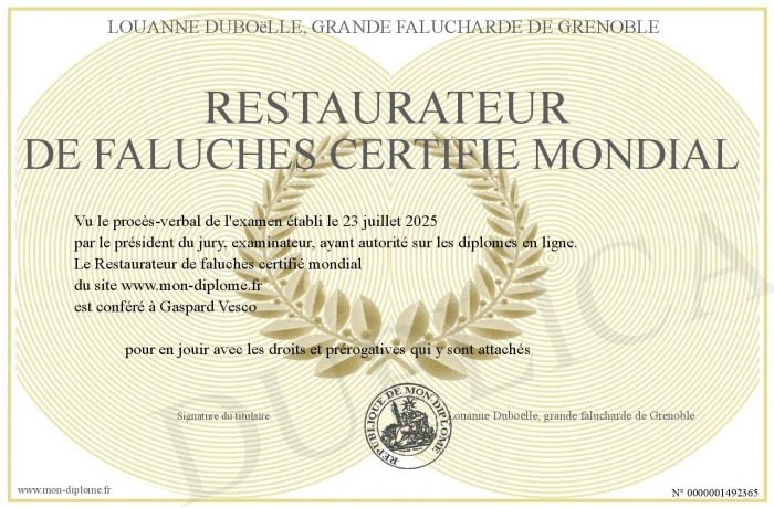 Envoyez par email votre Restaurateur de faluches certifié mondial personalisé