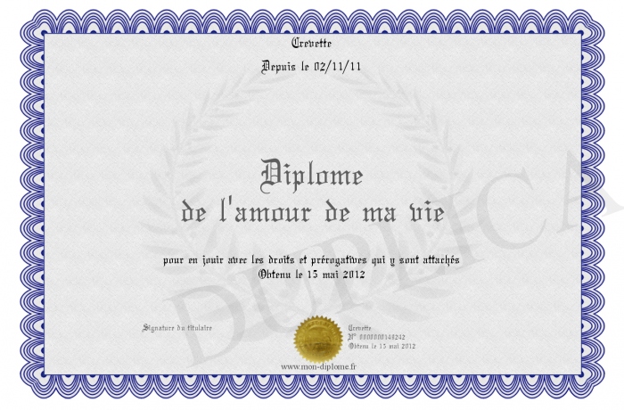 Envoyez par email votre Diplôme de l'amour de ma vie personalisé