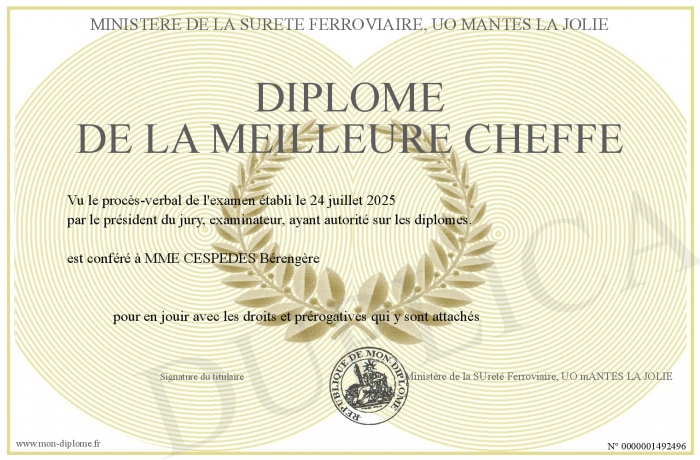 Envoyez par email votre Diplôme de LA MEILLEURE CHEFFE personalisé