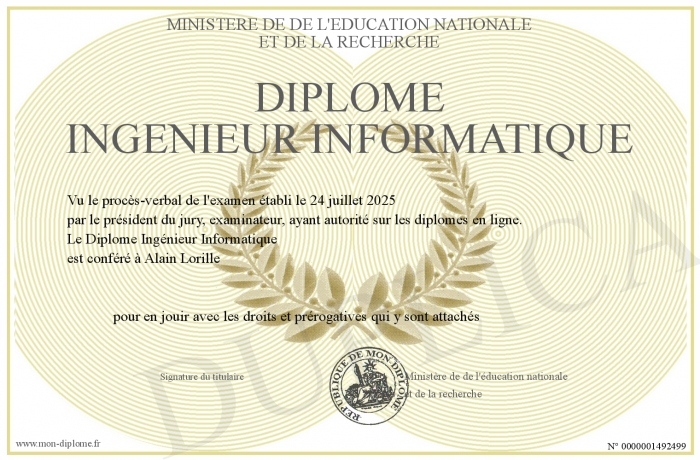 Envoyez par email votre Diplôme Ingénieur Informatique personalisé