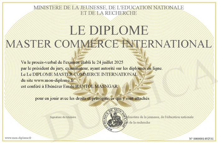Envoyez par email votre Le DIPLOME MASTER COMMERCE INTERNATIONAL personalisé