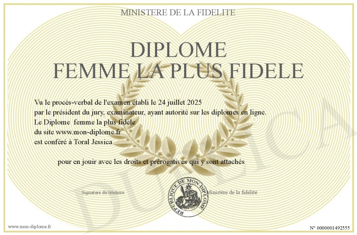 Envoyez par email votre Diplôme femme la plus fidèle personalisé