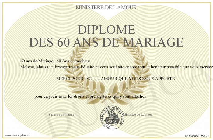Envoyez par email votre Diplôme des 60 Ans de Mariage personalisé