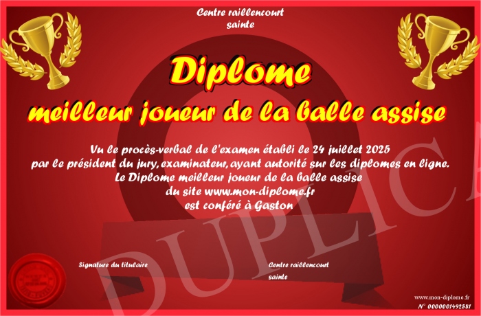 Envoyez par email votre Diplôme meilleur joueur de la balle assise personalisé