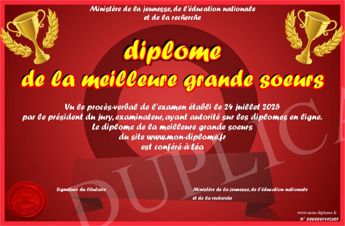 Envoyez par email votre diplome de la meilleure grande soeurs personalisé