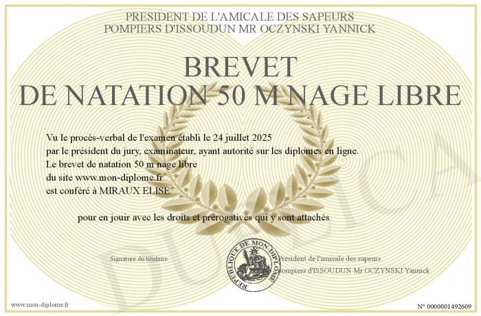 Envoyez par email votre brevet de natation 50 m nage libre personalisé
