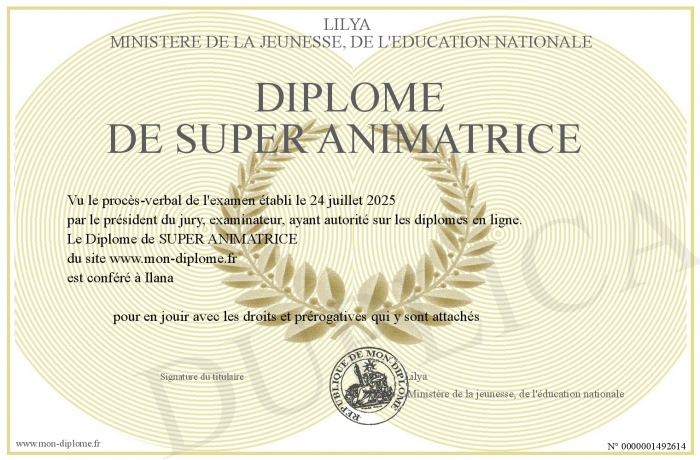 Envoyez par email votre Diplôme de SUPER ANIMATRICE personalisé