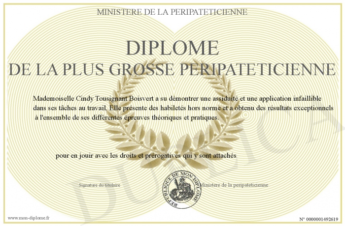 Envoyez par email votre Diplôme de la plus grosse peripateticienne personalisé